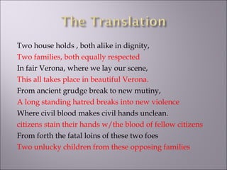 Two households both alike in dignity In fair Verona where we lay our scene From ancient grudgebreak to new mutiny Where civil blood makes civil hands unclean.